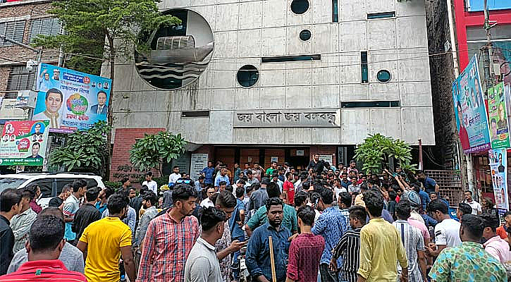 বঙ্গবন্ধু অ্যাভিনিউয়ে আওয়ামী লীগের কেন্দ্রীয় কার্যালয়ের সামনে সকাল থেকে অবস্থান নেন ঢাকা মহানগর দক্ষিণ ছাত্রলীগের নেতাকর্মীরা।