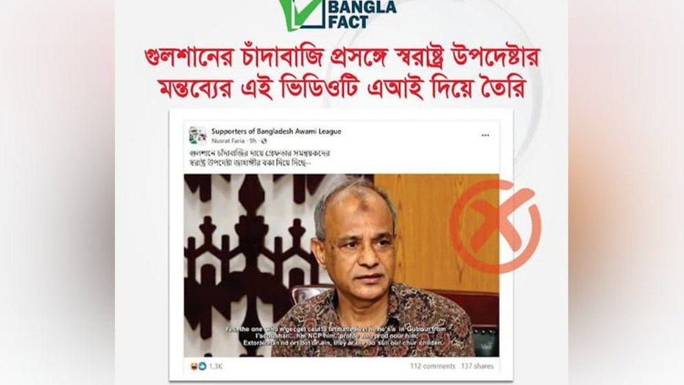 বাংলাফ্যাক্ট আরো জানায়, গুলশানের চাঁদাবাজি প্রসঙ্গে স্বরাষ্ট্র উপদেষ্টার মন্তব্যের যে ভিডিওটি ছড়ানো হয়েছে, সেটি এআই দিয়ে তৈরি।