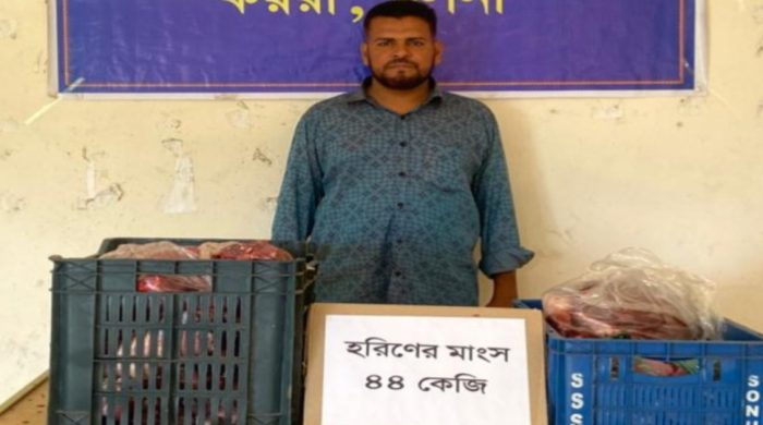 খুলনার কয়রা থানা পুলিশ ও নৌবাহিনীর যৌথ অভিযানে ৪৪ কেজি হরিণের মাংসসহ সেলিম হাওলাদার নামের এক ব্যক্তিকে আটক করেছে। সে উপজেলার ৬নং কয়রা এলাকার মৃত এইচ এম শওকত হোসেনের