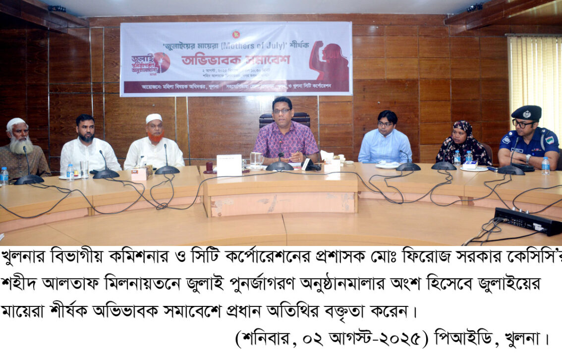 জুলাই পুনর্জাগরণ অনুষ্ঠানমালার অংশ হিসেবে ‘জুলাইয়ের মায়েরা (Mothers of July)’ শীর্ষক অভিভাবক সমাবেশ গতকাল (শনিবার) দুপুরে খুলনা সিটি কর্পোরেশনের শহীদ আলতাফ মিলনায়তনে অনুষ্ঠিত হয়। এতে প্রধান অতিথি ছিলেন খুলনার বিভাগীয় কমিশনার ও কেসিসি’র প্রশাসক মোঃ ফিরোজ সরকার। খুলনা জেলা প্রশাসন ও সিটি কর্পোরেশনের সহযোগিতায় মহিলা বিষয়ক অধিদপ্তরের খুলনা জেলা কার্যালয় এই অনুষ্ঠানের আয়োজন করে।