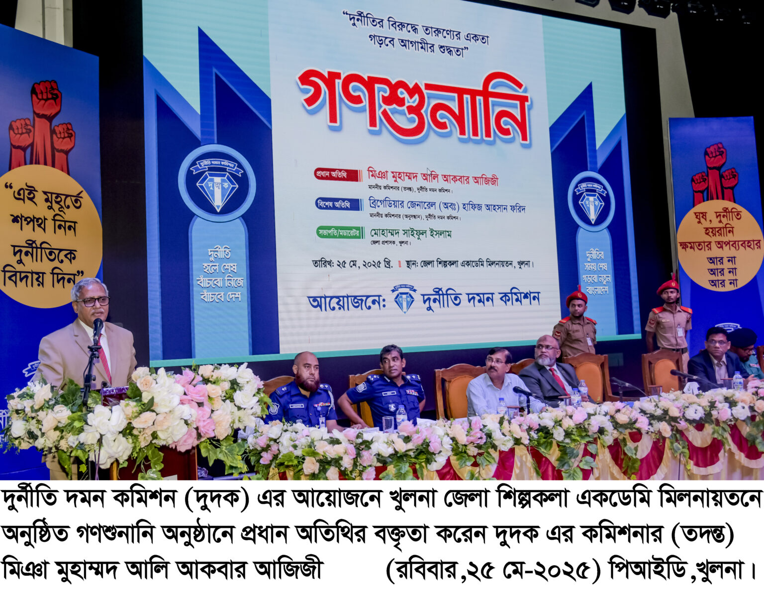 দুর্নীতি দমন কমিশন(দুদক) এর আয়োজনে খুলনা সদরে অবস্থিত সরকারি দপ্তরসমূহে সেবাবঞ্চিত ও হয়রানির শিকার নাগরিকদের অভিযোগ বিষয়ে সরাসরি গণশুনানি আজ(রবিবার) সকালে জেলা শিল্পকলা একাডেমি মিলনায়তনে অনুষ্ঠিত হয়। গণশুনানি অনুষ্ঠানে প্রধান অতিথি ছিলেন দুদকের কমিশনার (তদন্ত) মিঞা মুহাম্মদ আলি আকবার আজিজী।