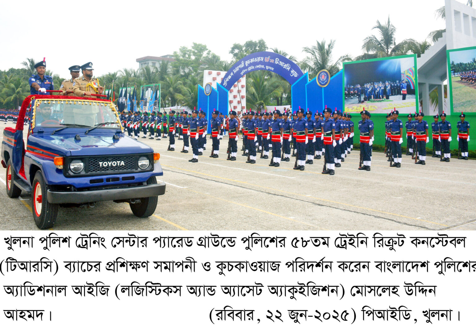 খুলনা পুলিশ ট্রেনিং সেন্টারে পুলিশের ৫৮তম ট্রেইনি রিক্রুট কনস্টেবল (টিআরসি) ব্যাচের প্রশিক্ষণ সমাপনী ও কুচকাওয়াজ আজ (রবিবার) সকালে ট্রেনিং সেন্টারের প্যারেড গ্রাউন্ডে অনুষ্ঠিত হয়। ৫৮তম টিআরসি ব্যাচের ৮১৭ জন প্রশিক্ষণার্থী এই সমাপনী ও কুচকাওয়াজে অংশগ্রহণ করে। অনুষ্ঠানে বাংলাদেশ পুলিশের অ্যাডিশনাল আইজি (লজিস্টিকস অ্যান্ড অ্যাসেট অ্যাকুইজিশন) মোসলেহ উদ্দিন আহমদ প্রধান অতিথি হিসেবে উপস্থিত থেকে মনোজ্ঞ কুচকাওয়াজ পরিদর্শন ও সালাম গ্রহণ করেন।