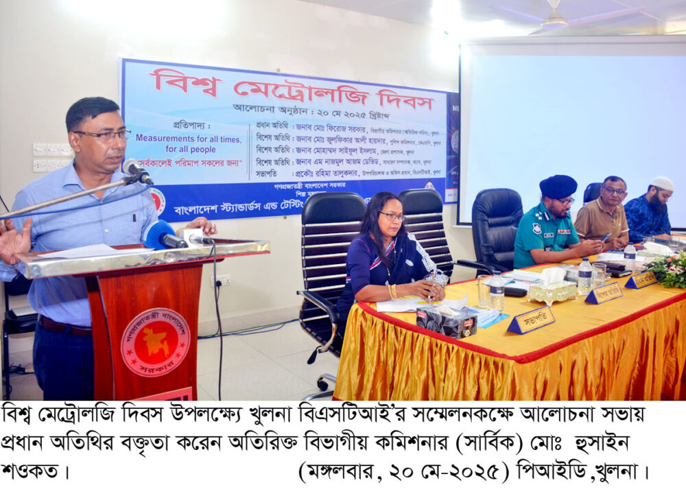 বিশ্ব মেট্রোলজি দিবস উপলক্ষ্যে আলোচনা সভা আজ (মঙ্গলবার) দুপুরে খুলনা বাংলাদেশ স্ট্যান্ডার্ডস এন্ড টেস্টিং ইনস্টিটিউশন (বিএসটিআই) সম্মেলনকক্ষে অনুষ্ঠিত হয়। এতে প্রধান অতিথি ছিলেন খুলনার অতিরিক্ত বিভাগীয় কমিশনার (সার্বিক) মোঃ হুসাইন শওকত। দিবসের এবারের প্রতিপাদ্য ‘সর্বকালেরই পরিমাপ সকলের জন্য’।
