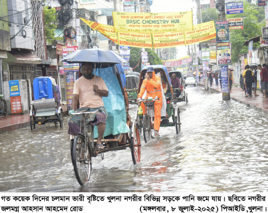 গত কয়েকদিনের ধারাবাহিক ভারী বৃষ্টিপাতের ফলে খুলনার জনজীবন বিপর্যস্ত হয়ে পড়েছে। নগরীর টুটপাড়া, রয়েল মোড়, মিস্ত্রিপাড়া, আহসান আহমেদ রোড-সহ বিভিন্ন সড়কে পানি জমে জলাবদ্ধতা তৈরি হয়েছে। এতে নগরীতে চলাচলকারী কর্মজীবী মানুষ, বিভিন্ন শিক্ষা প্রতিষ্ঠানের শিক্ষার্থী ও জনসাধারণকে ভোগান্তিতে পড়তে দেখা যায়।
