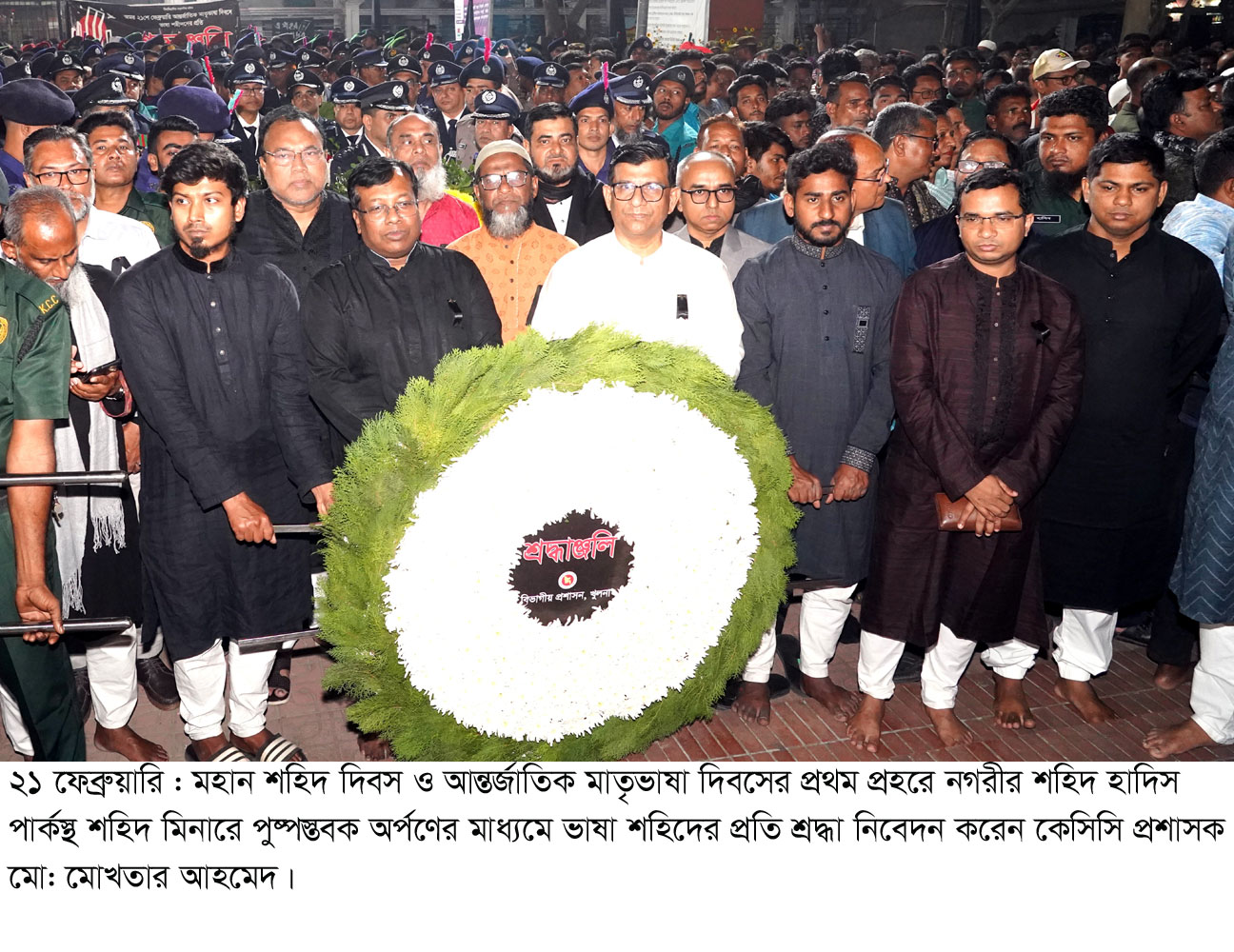 খুলনা সিটি কর্পোরেশন উদ্যোগে যথাযোগ্য মর্যাদায় মহান শহিদ দিবস ও আন্তর্জাতিক মাতৃভাষা দিবস ২০২৬ পালিত হয়েছে। দিবসের প্রথম প্রহরে কেসিসি প্রশাসক মো: মোখতার আহমেদ কর্মকর্তাদের সাথে নিয়ে নগরীর শহিদ হাদিস পার্কস্থ শহিদ মিনারে পুষ্পস্তবক অর্পণের মাধ্যমে ভাষা শহিদদের প্রতি শ্রদ্ধা নিবেদন করেন।