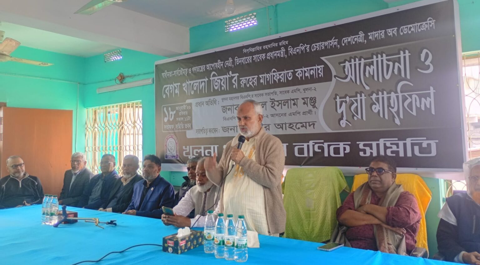 স্বাধীনতা, সার্বভৌমত্ব ও গণতন্ত্রে আপোষহীন নেতৃত্বের প্রতীক—বাংলাদেশের তিনবারের সাবেক প্রধানমন্ত্রী, বিএনপির চেয়ারপার্সন ও মাদার অব ডেমোক্রেসি দেশনেত্রী বেগম খালেদা জিয়ার রুহের মাগফেরাত কামনায় খুলনায় আলোচনা সভা ও দোয়া মাহফিল অনুষ্ঠিত হয়েছে।