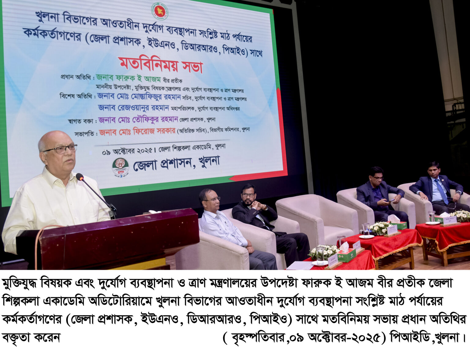 তিনি বৃহস্পতিবার রাতে খুলনা জেলা শিল্পকলা একাডেমি অডিটোরিয়ামে বিভাগের আওতাধীন দুর্যোগ ব্যবস্থাপনা সংশ্লিষ্ট মাঠ পর্যায়ের কর্মকর্তাগণের সাথে মতবিনিময় সভায় প্রধান অতিথির বক্তৃতায় একথা বলেন।