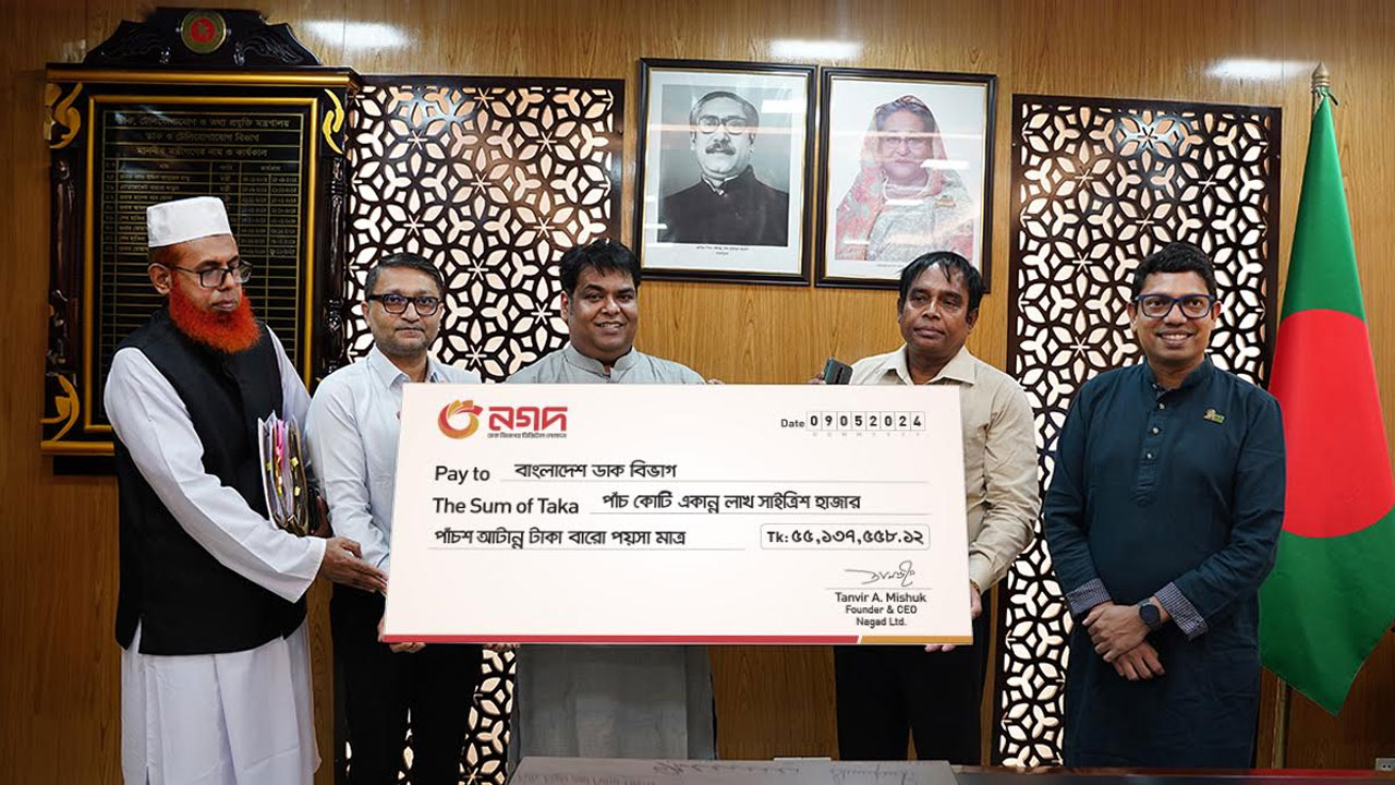 দেশের শীর্ষস্থানীয় মোবাইল ফাইন্যান্সিয়াল সার্ভিস নগদ প্রতি বছরের মতো এবারও বাংলাদেশ ডাক বিভাগের সঙ্গে রাজস্ব ভাগাভাগি করেছে। ২০২৩ সালের আয় থেকে ৫ কোটি ৫১ লাখ ৩৭ হাজার ৫৫৮ টাকার রাজস্ব ডাক বিভাগকে বুঝিয়ে দিয়েছে নগদ।