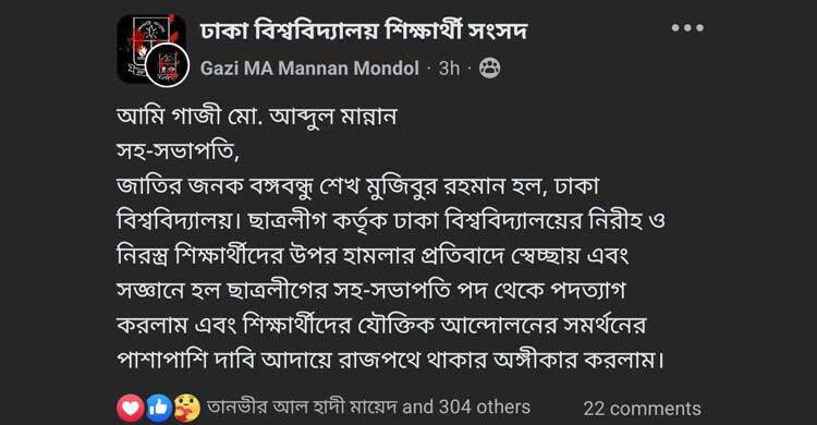 কুয়েত মৈত্রী হল থেকে পদত্যাগ করা জুয়েনা আলম মুন লিখেছেন, আমি জুয়েনা আলম মুন, অর্থ সম্পাদক বাংলাদেশ ছাত্রলীগ, বাংলাদেশ-কুয়েত মৈত্রী হল, ঢাকা বিশ্ববিদ্যালয়। ছাত্রলীগকে ন্যায়ের কাণ্ডারি ভেবে ছাত্রলীগ করতাম। কিন্তু এখন এই সংগঠনের সঙ্গে নিজের সম্পৃক্ততা ছিল এটা মনে করলেও আমার রক্তাক্ত বন্ধু-বান্ধবী, সিনিয়র, জুনিয়রদের চেহারা মনে পড়বে। তাই স্বেচ্ছায়, সজ্ঞানে পদত্যাগ করছি। আমার সঙ্গে কারো ব্যক্তিগত কোনো শত্রুতা নেই। পদের অব্যাহতির ব্যাপারটা কেউ পারসোনালি নেবেন না। যারা ভালোবাসা পাবার যোগ্য তারা সব সময়ই ভালোবাসা পাবেন।