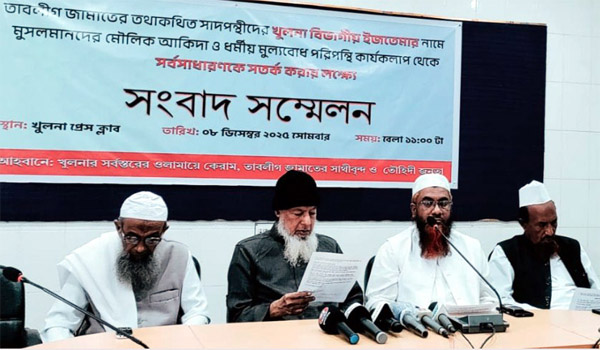সংবাদ সম্মেলনে আরও বলা হয়, টঙ্গী বিশ্ব ইজতেমার ময়দানে এই ভ্রান্ত গোষ্ঠীর হাতে একাধিকবার নিরীহ তাবলীগের সাথী, আলেম-ওলামা, ছাত্র ও সাধারণ মানুষের রক্ত ঝরেছে, হত্যাকাণ্ড ও গুরুতর আহতের ঘটনাও ঘটেছে। তাদের অনেকের নামে মামলাও হয়েছে। এই প্রেক্ষাপটে সরকার বাধ্য হয়ে টঙ্গী ময়দান ও কাকরাইল মারকাজ হক্কানি ওলামায়ে কেরামের তত্ত¡াবধানে প্রকৃত তাবলীগ জামাতের কাছে অর্পণ করেছে। কিন্তু এই ফেতনা ও বিশৃঙ্খলা সৃষ্টিকারী ভ্রান্ত গোষ্ঠী বিভিন্ন জায়গায় ইজতেমা আয়োজনের মাধ্যমে সাধারণ মুসলমানদের ইসলামের সঠিক চিন্তাধারা ও মূলধারা থেকে বিচ্যুত করার ঘৃণ্য ষড়যন্ত্রে লিপ্ত করছে। তারই ধারাবাহিকতায় ভ্রান্ত সন্ত্রাসী সাদপন্থীরা তথাকথিত “খুলনা বিভাগীয় ইজতেমার” নামে ধর্মপ্রাণ সাধারণ মানুষের দ্বীন এবং ঈমান নষ্টের পাঁয়তারা চালিয়ে যাচ্ছে। তথাকথিত এই ইজতেমার সাথে খুলনা জেলার উলামায়ে কেরাম এবং মূল ধারার দাওয়াত ও তাবলীগের সাথীদের কোন সম্পৃক্ততা নেই।