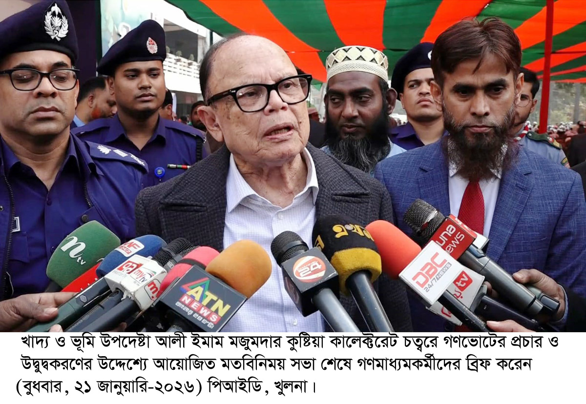 বাংলাদেশ আগামী পাঁচ বছর কীভাবে চলবে বা পরবর্তীতে কীভাবে চলবে তা নির্ভর করবে গণভোটে ‘হ্যাঁ’ দেওয়ার ওপর। আপনারা দেশের মালিক, কাদের নিয়ে দেশ চালাবেন তা নির্ভর করে আপনাদের ওপর। আজ (বুধবার) কুষ্টিয়া কালেক্টরেট চত্বরে গণভোটের প্রচার ও উদ্বুদ্বকরণের উদ্দেশ্যে আয়োজিত মতবিনিময় সভায় প্রধান অতিথির বক্তৃতায় খাদ্য ও ভূমি উপদেষ্টা আলী ইমাম মজুমদার এসব কথা বলেন।