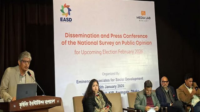 বেসরকারি সংস্থা এমিনেন্স অ্যাসোসিয়েটস ফর সোশ্যাল ডেভেলপমেন্ট (ইএএসডি) এই জনমত জরিপ চালায়। সোমবার (৫ জানুয়ারি) বিকেলে রাজধানীর ফার্মগেটে কেআইবি মিলনায়তনে জরিপের ফল তুলে ধরেন ইএএসডির প্রধান নির্বাহী কর্মকর্তা শামীম হায়দার তালুকদার।