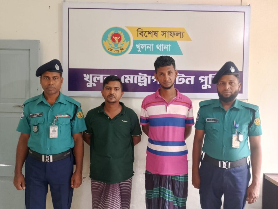 সন্ত্রাসমুক্ত নগরী গড়ার লক্ষ্যে খুলনা মেট্রোপলিটন পুলিশের পাশাপাশি সশস্ত্র বাহিনীও নিরলসভাবে কাজ করে যাচ্ছে। এরই ধারাবাহিকতায় ১৭ জুন ২০২৫ খ্রিঃ তারিখ সকাল ৫.৪০ ঘটিকায় রূপসা স্ট্যান্ড রোডের একটি দোতলা বাড়িতে গোপন সংবাদের ভিত্তিতে বাংলাদেশ সেনাবাহিনী ও খুলনা থানা পুলিশ যৌথভাবে অভিযান চালিয়ে সন্ত্রাসী ১) রাজু আহমেদ (৩০), পিতা-মৃত নুরুল ইসলাম, সাং-রূপসা স্ট্যান্ড রোড, থানা-খুলনা এবং ২) জুনায়েদ হোসেন মুন্না (৩০), পিতা-মৃত: শামসুর রহমান, সাং-২৩ ডাঃ আলতাফ হোসেন লেন, থানা-খুলনাদ্বয়কে গ্রেফতার করে। গ্রেফতারকৃত আসামীদ্বয়ের হেফাজত হতে ১টি রিভলবার এবং ২ রাউন্ড গুলি উদ্ধার করা হয়েছে। তাদের বিরুদ্ধে খুলনা থানায় অস্ত্র আইনে মামলা রুজু করা হয়েছে।