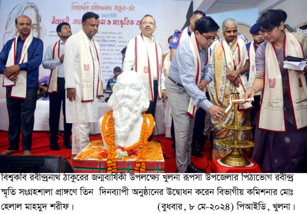 বিশ্বকবি রবীন্দ্রনাথ ঠাকুরের ১৬৩তম জন্মবার্ষিকী উপলক্ষ্যে তিন দিনব্যাপী অনুষ্ঠানের উদ্বোধন, আলোচনা সভা ও সাংস্কৃতিক অনুষ্ঠান আজ (বুধবার) সকালে খুলনা রূপসা উপজেলার পিঠাভোগ রবীন্দ্র স্মৃতি সংগ্রহশালা প্রাঙ্গণে অনুষ্ঠিত হয়। অনুষ্ঠানে প্রধান অতিথি হিসেবে উপস্থিত ছিলেন খুলনার বিভাগীয় কমিশনার মোঃ হেলাল মাহমুদ শরীফ।