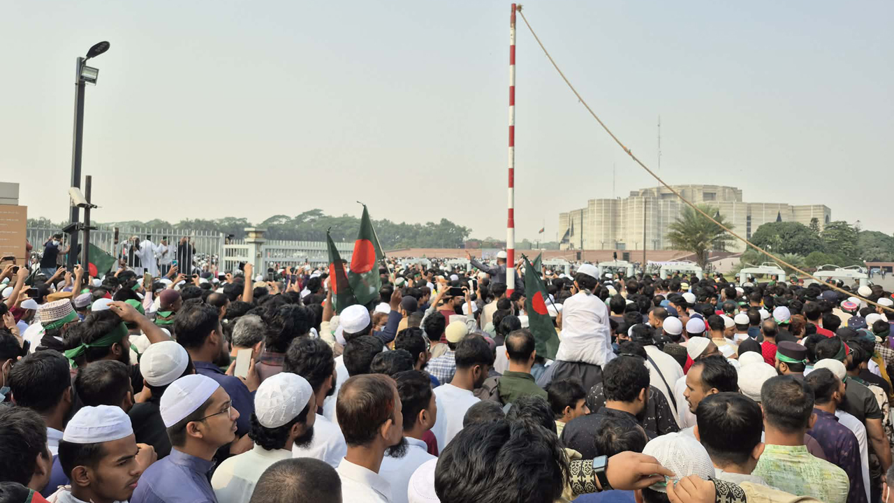 ইনকিলাব মঞ্চের মুখপাত্র শহীদ শরীফ ওসমান হাদির নামাজে জানাজায় অংশ নিতে জাতীয় সংসদের দক্ষিণ প্লাজা ও মানিক মিয়া এভিনিউ এলাকায় লাখো মানুষের ঢল নেমেছে। খামারবাড়ি থেকে আসাদ গেট পর্যন্ত পুরো এলাকা এখন জনসমুদ্রে পরিণত হয়েছে। হাতে জাতীয় পতাকা আর মুখে স্লোগান নিয়ে আসা এই বিশাল জনস্রোত সামাল দিতে এবং ১৬টি প্রবেশপথ দিয়ে মানুষকে ভেতরে ঢোকাতে হিমশিম খাচ্ছে আইনশৃঙ্খলা রক্ষাকারী বাহিনী। জানাজার সময় যত ঘনিয়ে আসছে, মানুষের উপস্থিতি ততই বাড়ছে।