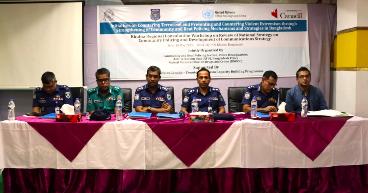 পুলিশ সদর দপ্তর, বাংলাদেশ পুলিশের বিশেষায়িত ইউনিট এন্টি টেররিজম ইউনিট (ATU) ও United Nations Office on Drugs and crime (UNODC) এর যৌথ উদ্যোগে “Initiatives on Countering Terrorism & Violent Extremism through Strengthening of Community and Beat Policing Mechanisms and Strategies in Bangladesh” শীর্ষক প্রকল্পের আওতায় এক কর্মশালা অনুষ্ঠিত হয়। রিজিওনাল কনসালটেশন এর অংশ হিসেবে গতকাল ১৮ মে ২০২৫ তারিখ নগরীর হোটেল সিটি ইন এ কেএমপি এবং খুলনা রেঞ্জ হতে ৩৭ জন ইন্সপেক্টর হতে তদূর্ধ্ব পদমর্যাদার পুলিশ কর্মকর্তাদের নিয়ে এই কর্মশালার আয়োজন করা হয়। কর্মশালায় প্রধান অতিথি হিসেবে উপস্থিত ছিলেন এন্টি টেররিজম ইউনিটের ডিআইজি (ক্রাইম এন্ড ইনভেস্টিগেশন) জনাব মফিজ উদ্দিন আহমেদ, পিপিএম এবং বিশেষ অতিথি হিসেবে উপস্থিত ছিলেন খুলনা রেঞ্জের ডিআইজি জনাব মোঃ রেজাউল হক, পিপিএম।