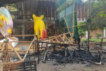 ঢাকা বিশ্ববিদ্যালয়ের চারুকলা অনুষদে নববর্ষের শোভাযাত্রা উদযাপনের জন্য তৈরি দুটি মোটিফে আগুন…