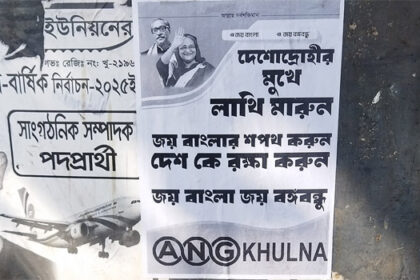 খুলনা নগরী ও পূর্ব রূপসায় সাটা হয়েছে আ’লীগের স্লোগান লেখা পোস্টারনিষিদ্ধ